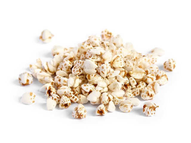 Quinoakerne werden vorgewärmt und in einem Druckbehälter mit Dampf gesättigt bevor sie im Expansionskanal in Sekundenbruchteilen gepufft werden. Quinoa ist ein kleinkörniges Getreide aus der Andenregion und von Natur aus glutenfrei.